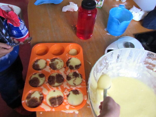 Die Mädchen und Burschen haben mit großer Freude Muffins gebacken. Unter Anleitung wurden Mehl, Backpulver, Öl und Zucker verrührt.