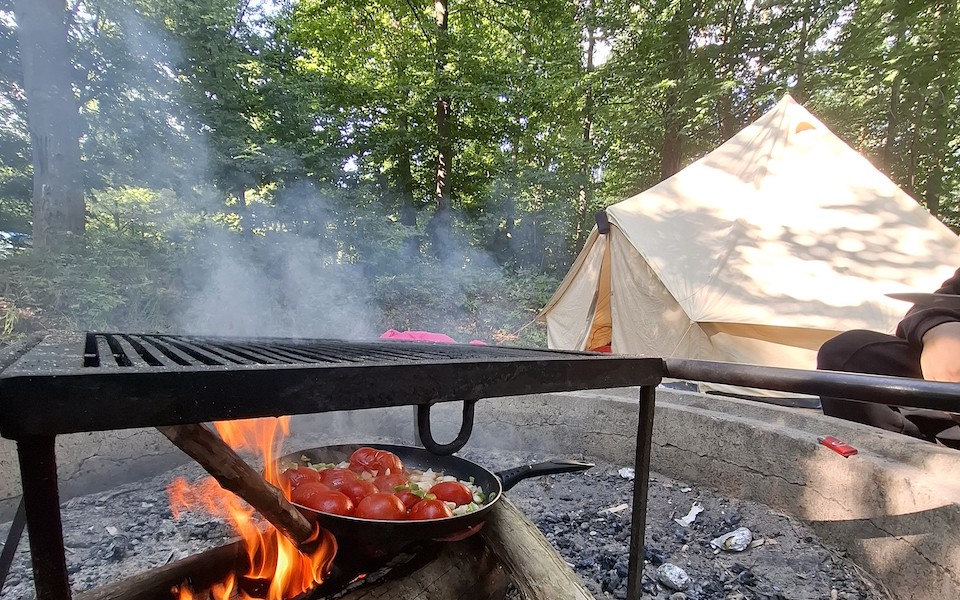 Gekocht wurde ausschließlich über dem offenen Feuer – einfache, aber richtig schmackhafte Gerichte, zu denen alle etwas beizutragen wussten, gemeinsam zubereitet und unter freiem Himmel verspeist. Abends saßen alle am Lagerfeuer bei Musik aus der Box und schauten in die Flammen, die Geschichten zu erzählen schienen. Die Stimmung war entspannt, offen und ehrlich – es wurde gelacht, erzählt, manchmal einfach nur geschwiegen und zugehört.